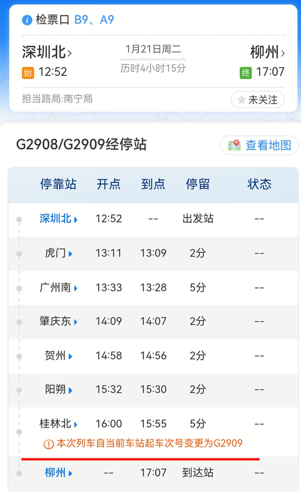 “中途站下车活动了一下,怎么我乘坐的G2908次列车变成G2909了,难道是我坐错车了?”1月20日,旅客吴先生从深圳北站乘高铁前往柳州,列车到达桂林北站后,他发现车次变了,非常疑惑,赶忙询问列车工作人员。