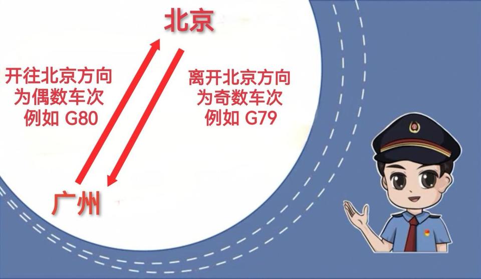 为了更好的认识“折角车次”,首先要知道什么是铁路的“上行”和“下行”。根据铁路部门规定,开往北京方向或者从支线开往干线的列车为“上行”,车次数字是双数;离开北京方向或从干线开往支线的列车为“下行”,车次数字是单数。例如,香港西九龙站到北京西站列车是向着北京方向开行,为“上行”,其车次用的是G80次,反向则为“下行”,车次变更为G79次。